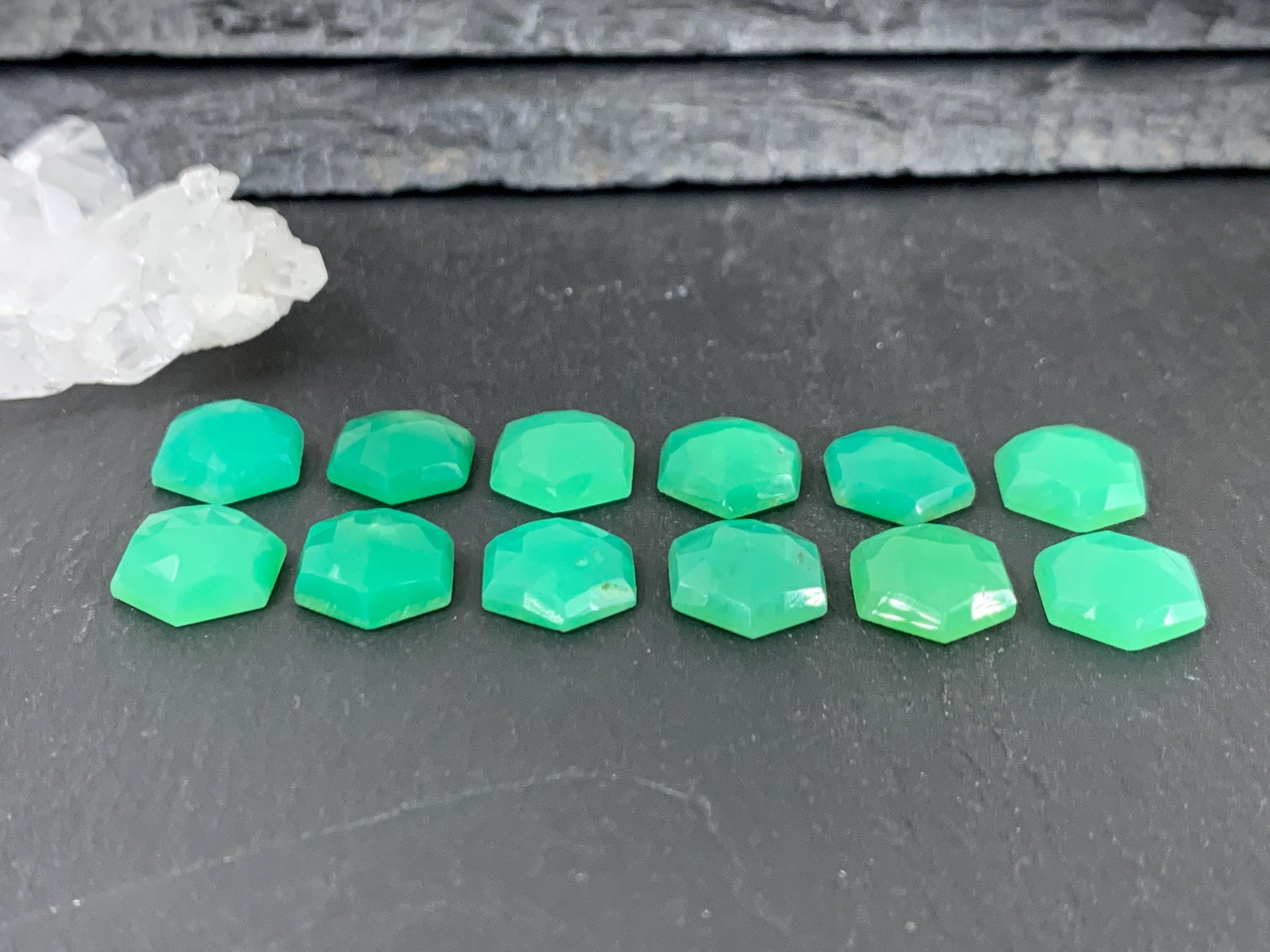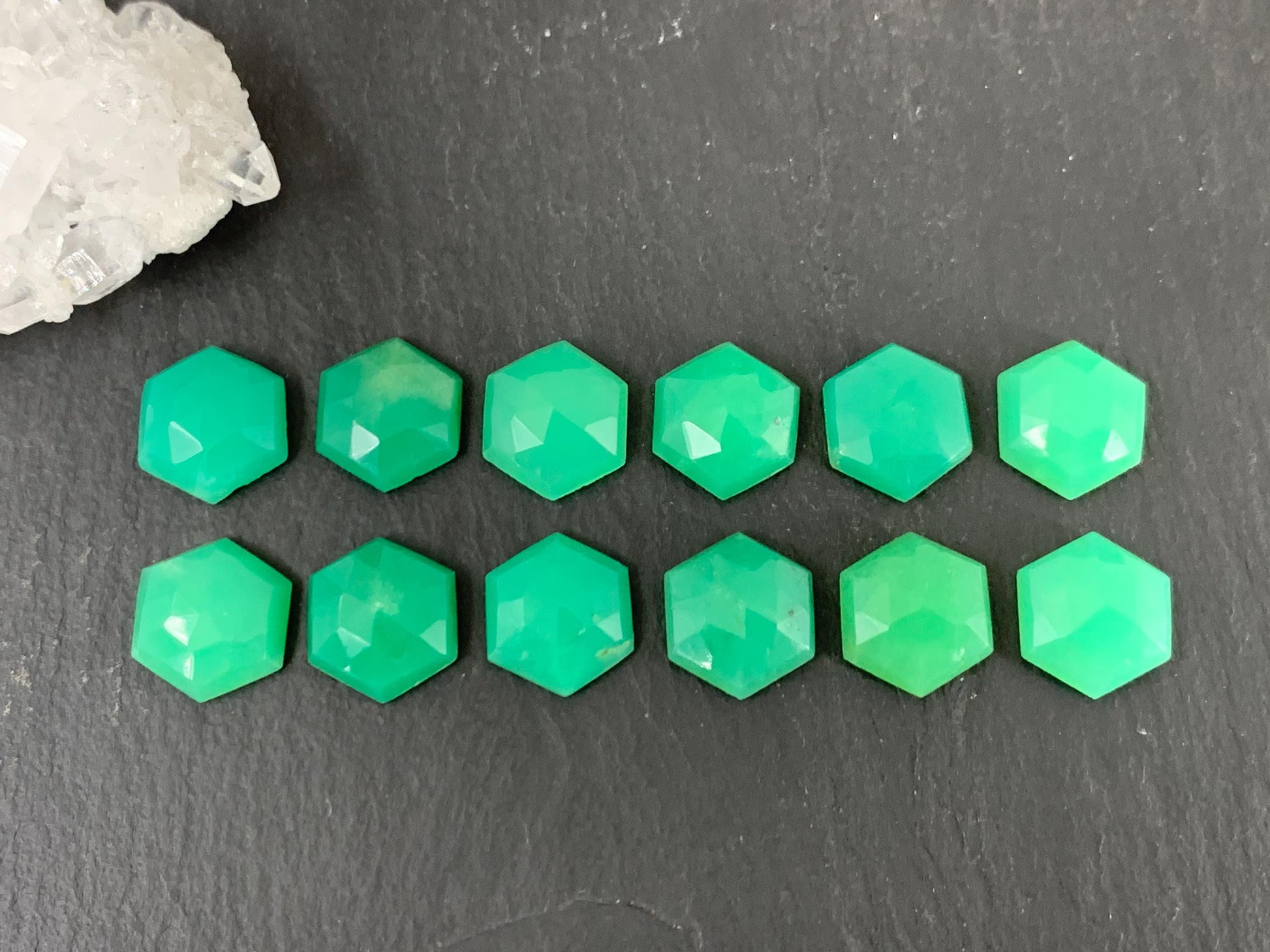 This faceted chrysoprase cabochon is a stunning 10mm hexagonal faceted green gemstone jewel, perfect for chrysoprase jewelry making and adding vibrant natural color to your designs. The natural chrysoprase stone features a rose cut cabochon style that enhances its brilliance and depth, making it an eye-catching centerpiece. Each green chrysoprase gem measures approximately 10x11mm with a thickness of 3-4mm, offering a precise size ideal for various jewelry projects. Crafted as a hexagonal faceted gem, this faceted green jewel delivers exceptional sparkle and clarity, ensuring your creations stand out.