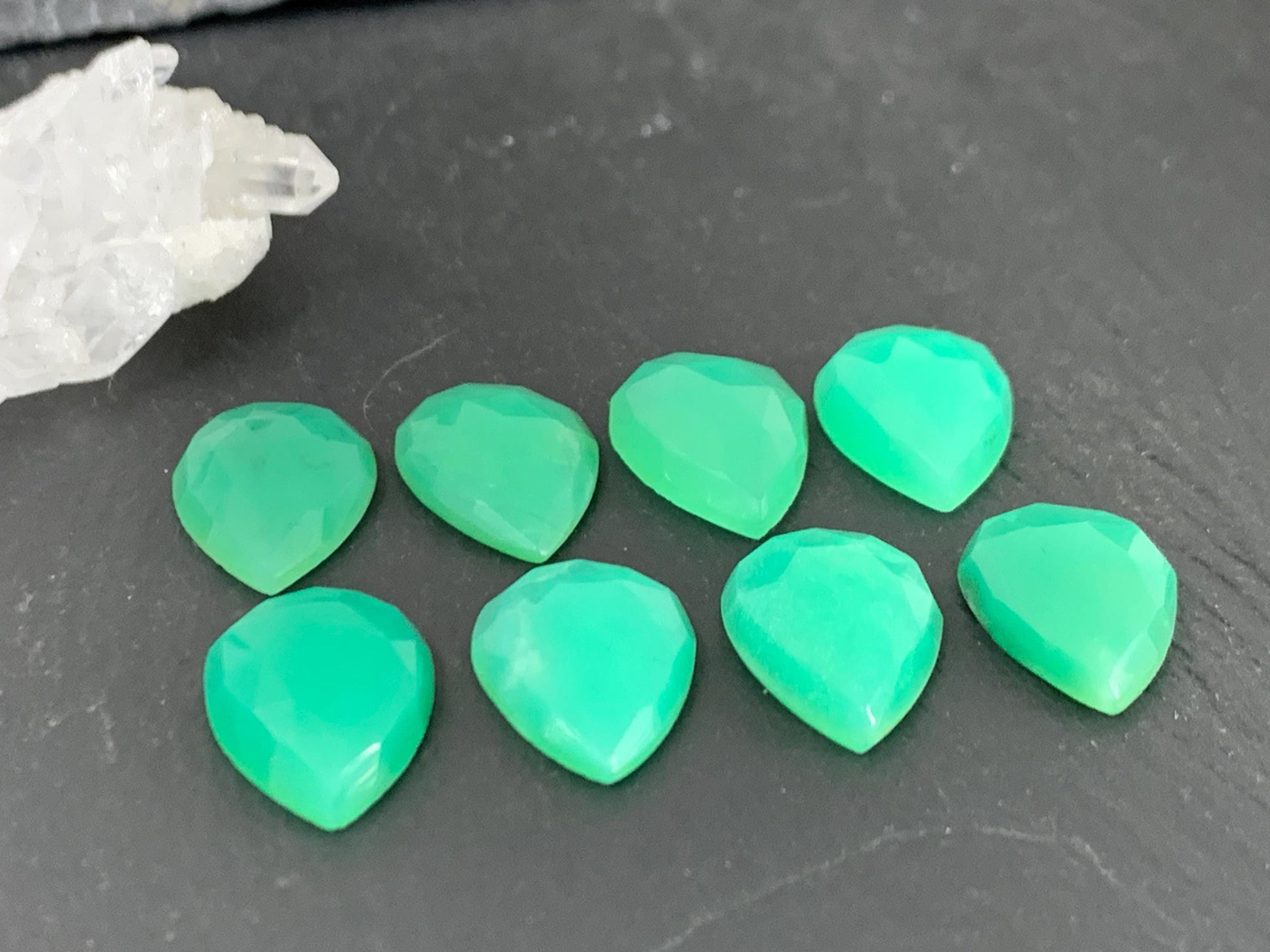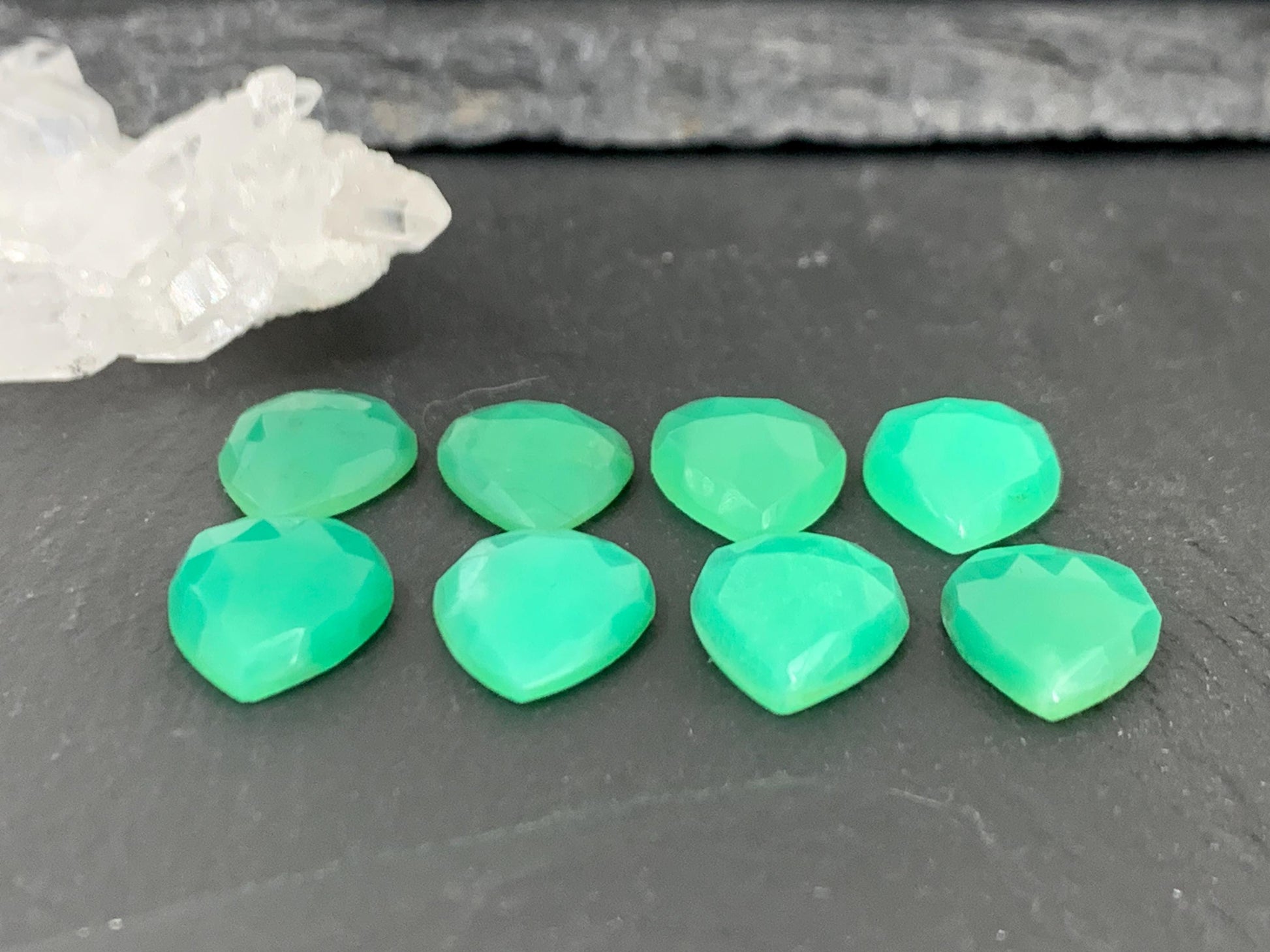 - Shape: pear shaped gemstone with precise rose cut chrysoprase facets