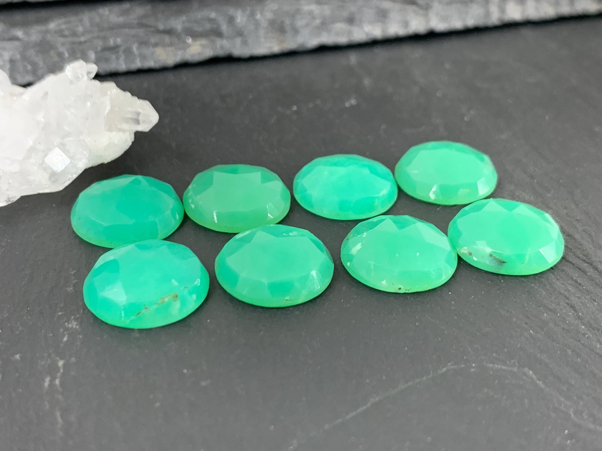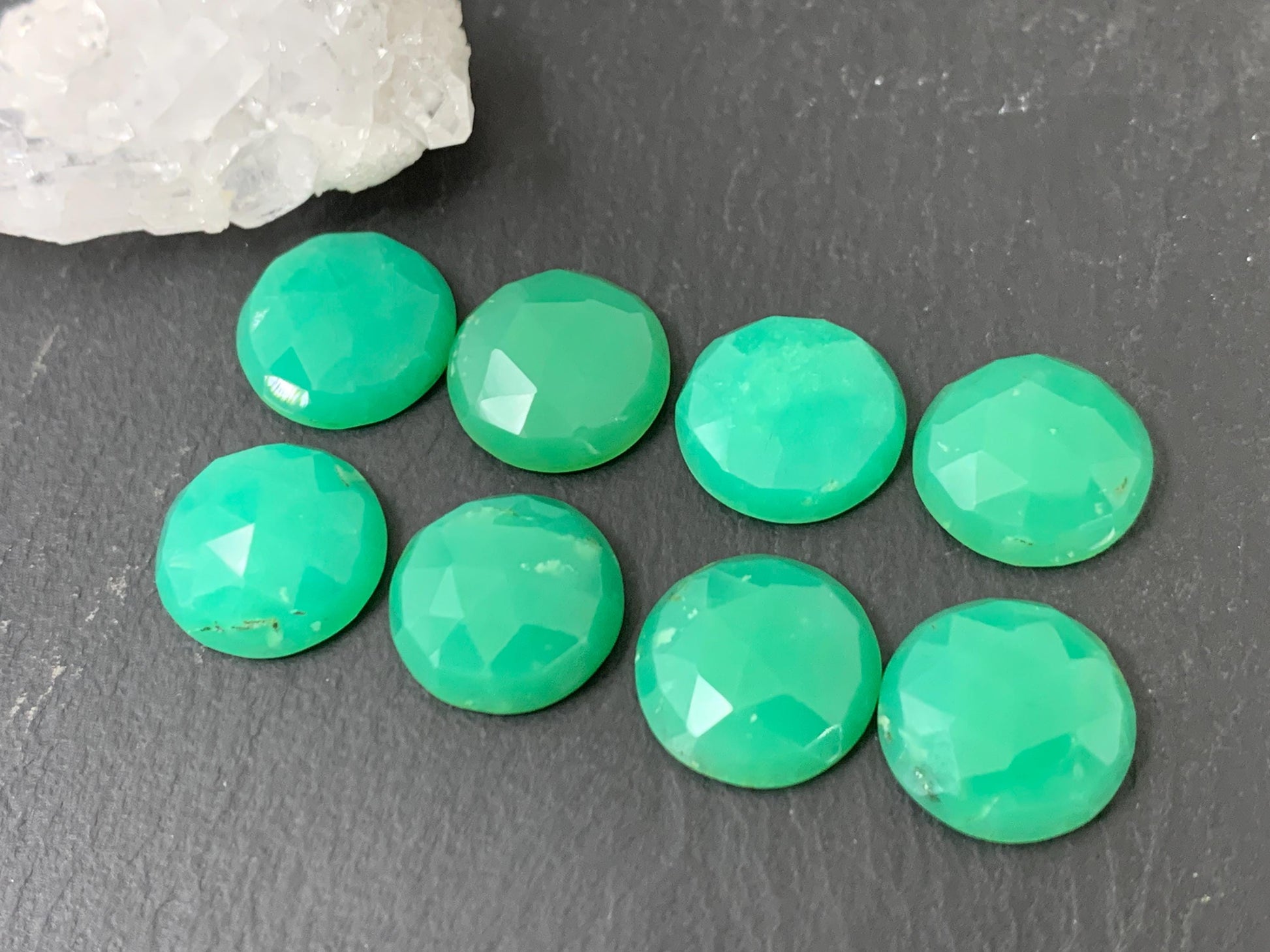 - Faceted chrysoprase cabochon with a rose cut that enhances light reflection