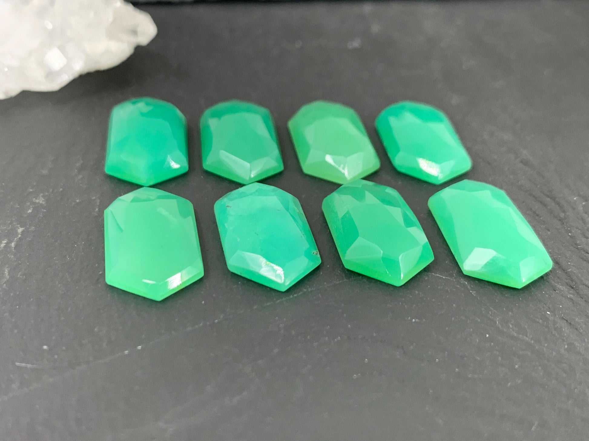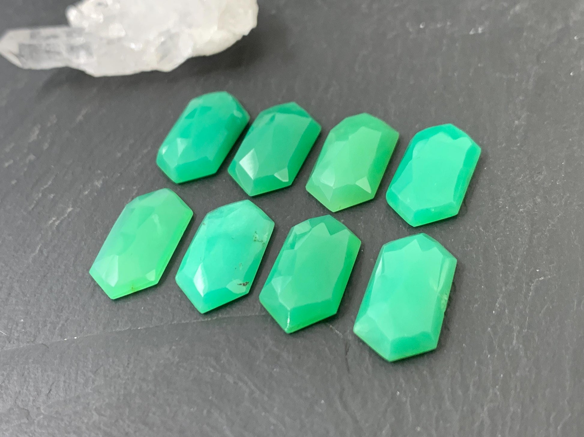 This faceted chrysoprase cabochon is a long hexagon 10x20mm rose cut green gemstone ideal for jewelry making parts, offering a unique green cabochon that enhances any design with natural beauty and vibrant color. Crafted from natural chrysoprase stone, each 10x20mm faceted gem features a faceted long hexagon shape with precise dimensions of 10x20mm and thickness ranging from 2 to 4.5mm, making it perfect for handmade jewelry stones and gemstone crafting supplies. The rose cut green gem surface provides a brilliant sparkle that highlights the rich green chrysoprase gem hues.