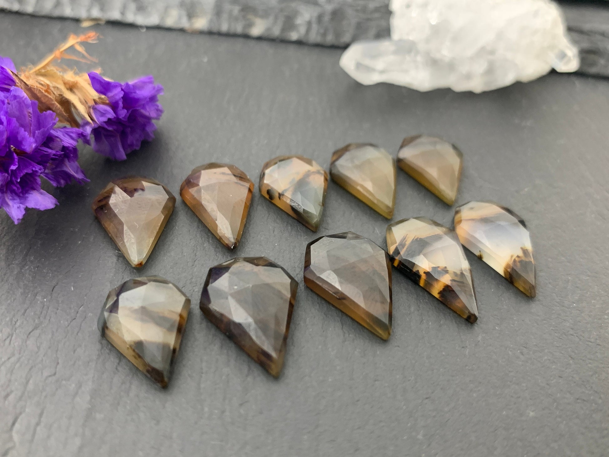 Faceted Montana Agate shield 16-17mm long cabochon