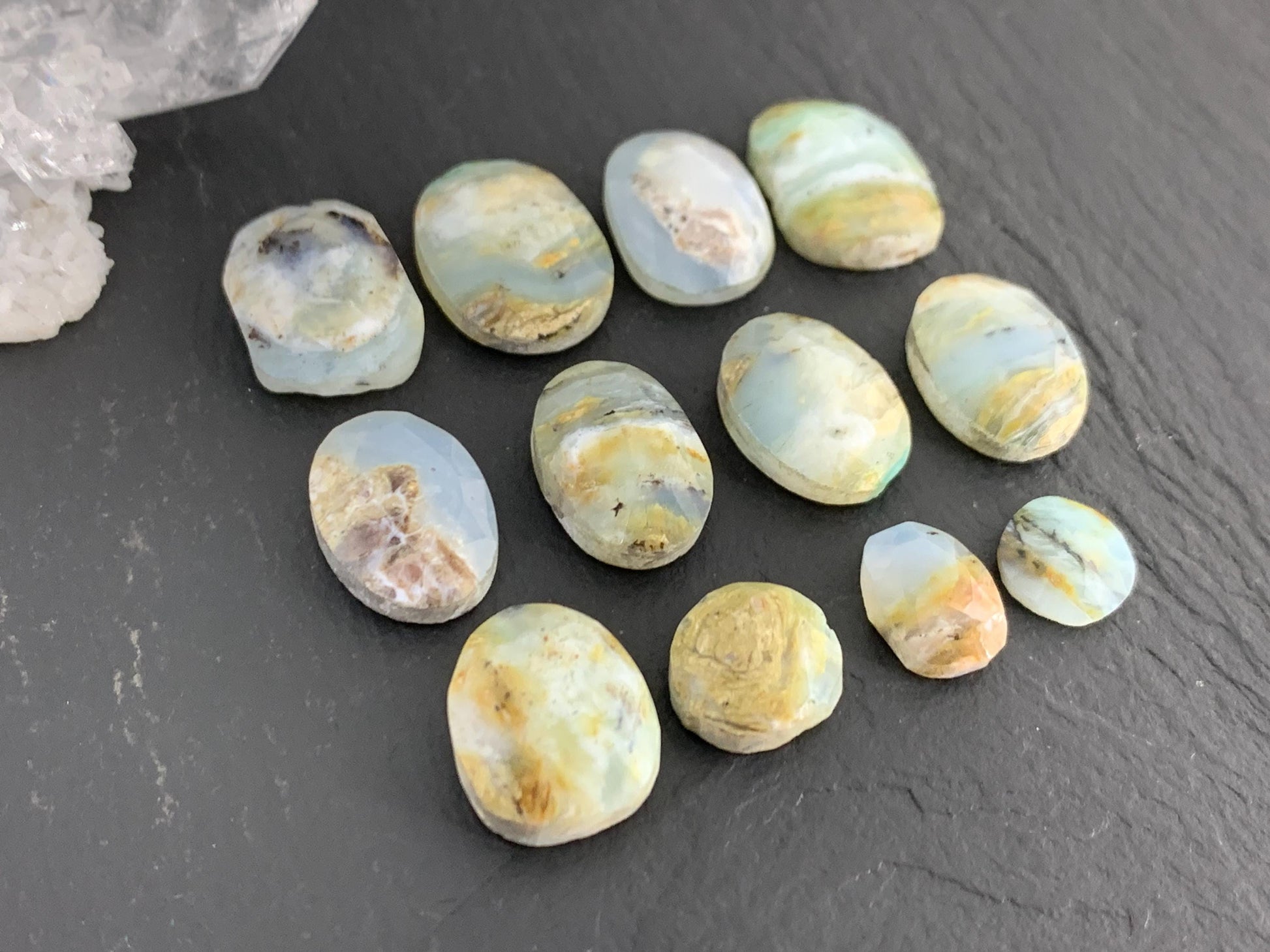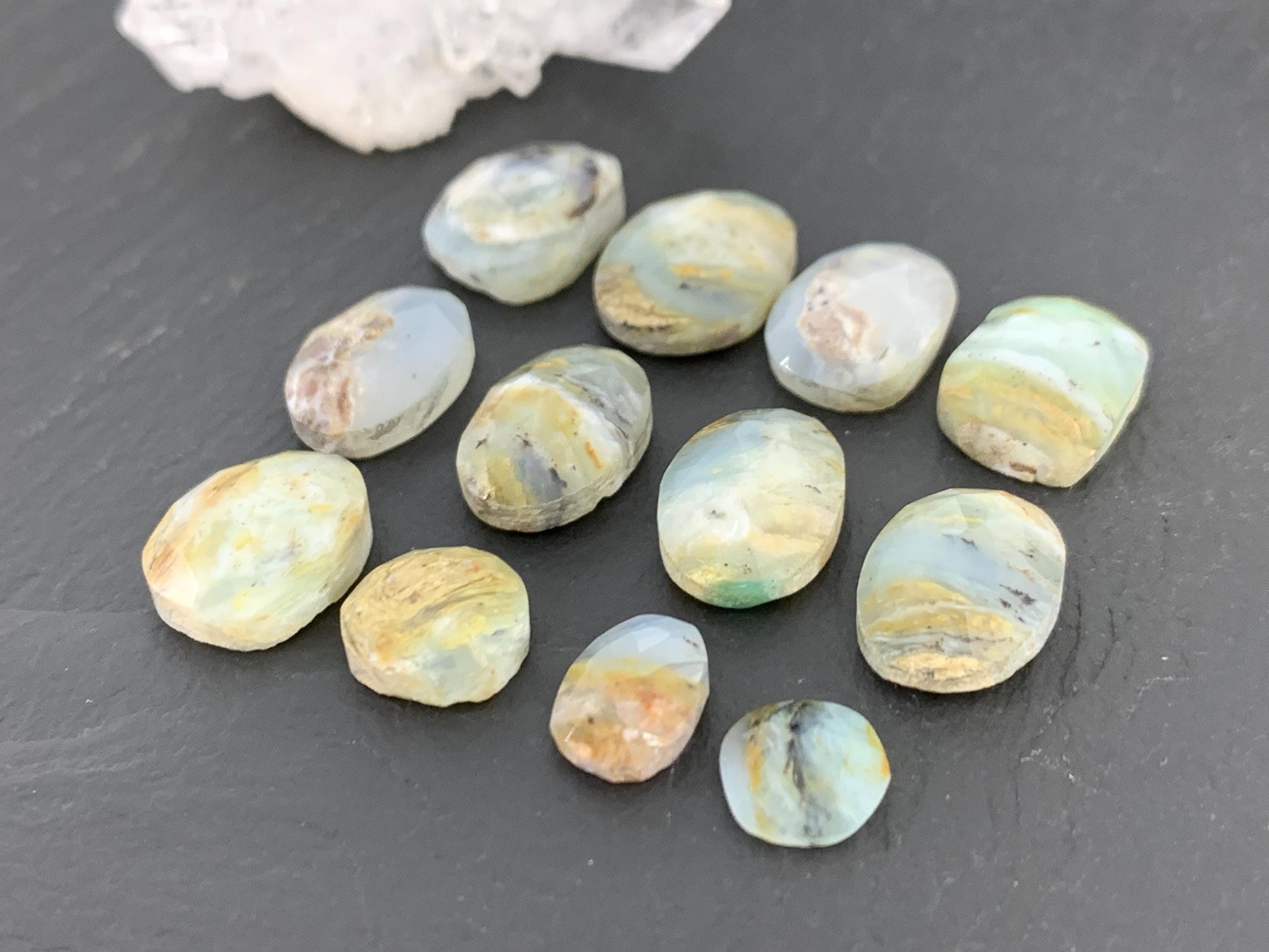 Faceted Peruvian Opal 8-14mm long cabochon.