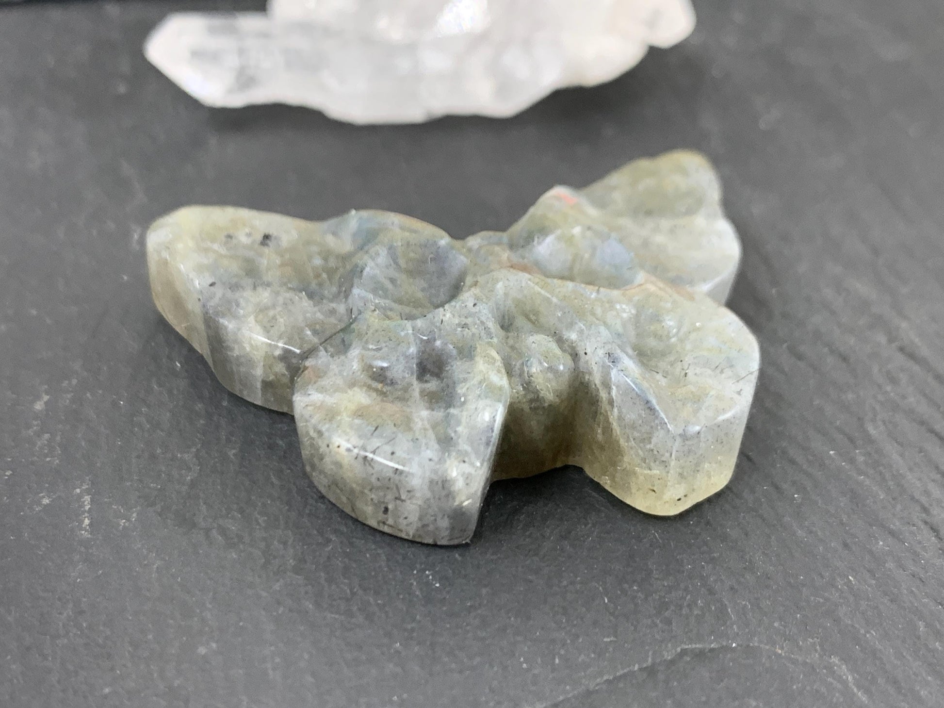 Whether you are creating custom jewelry or enhancing your ornamental collection, this labradorite butterfly carving combines natural beauty with expert craftsmanship. Its flat back gemstone form allows easy integration into many projects while the unique ghost face carving adds an artistic touch. Enjoy the vibrant play of colors characteristic of labradorite gemstone in this exquisite decorative piece.