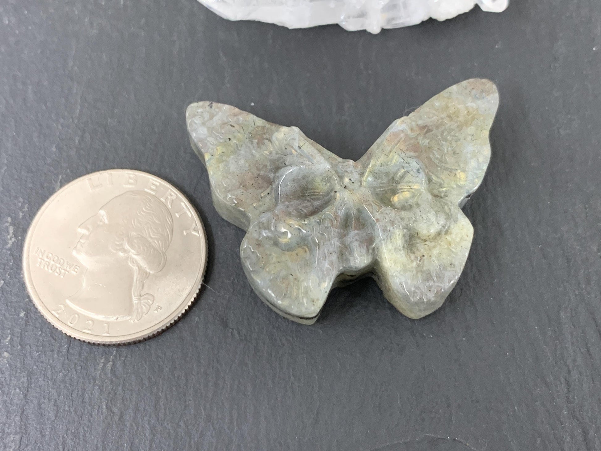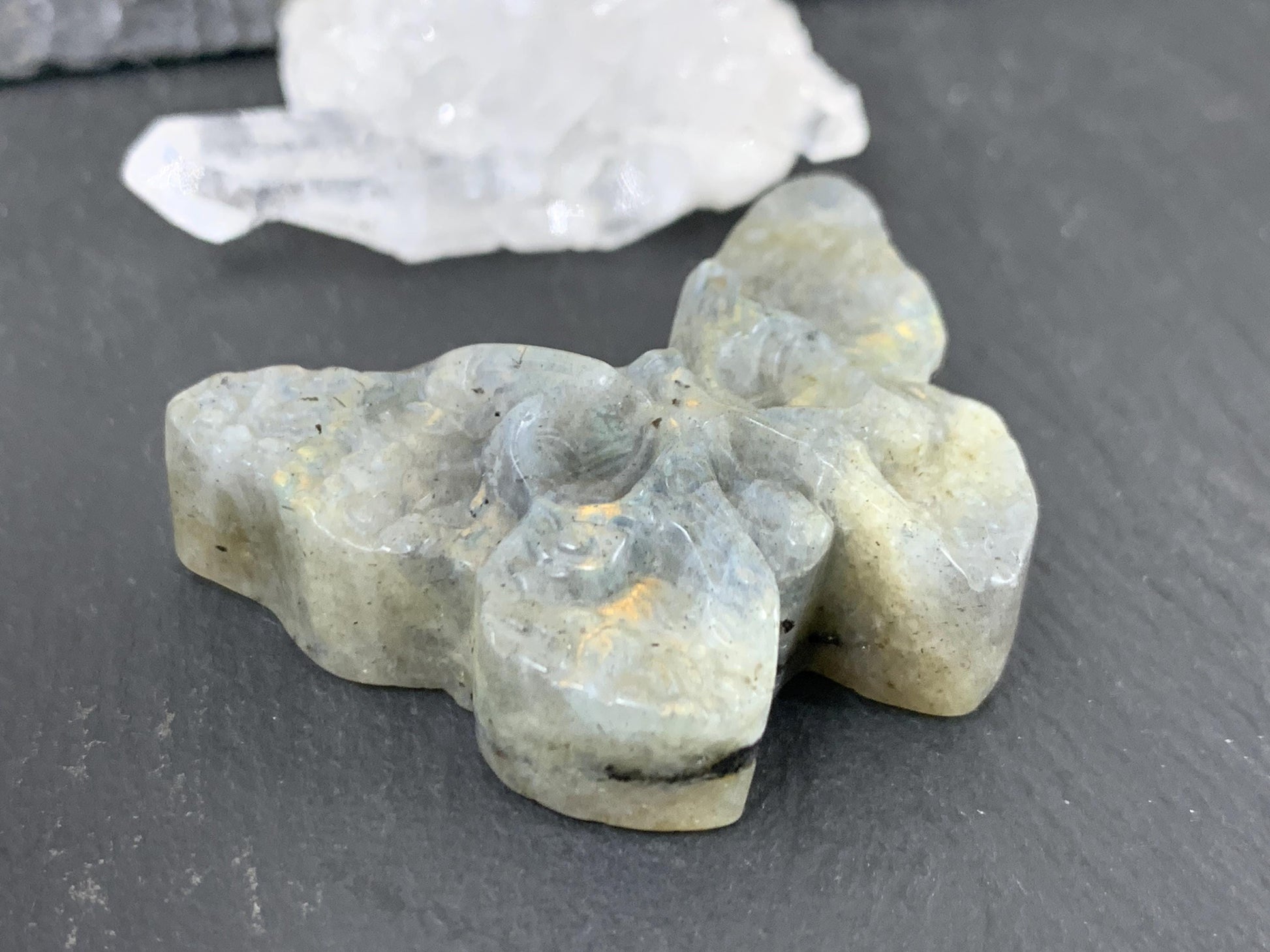Labradorite Ghost Butterfly – Hand Carved Gemstone Flat Back Carving, Artisan Crystal Gift