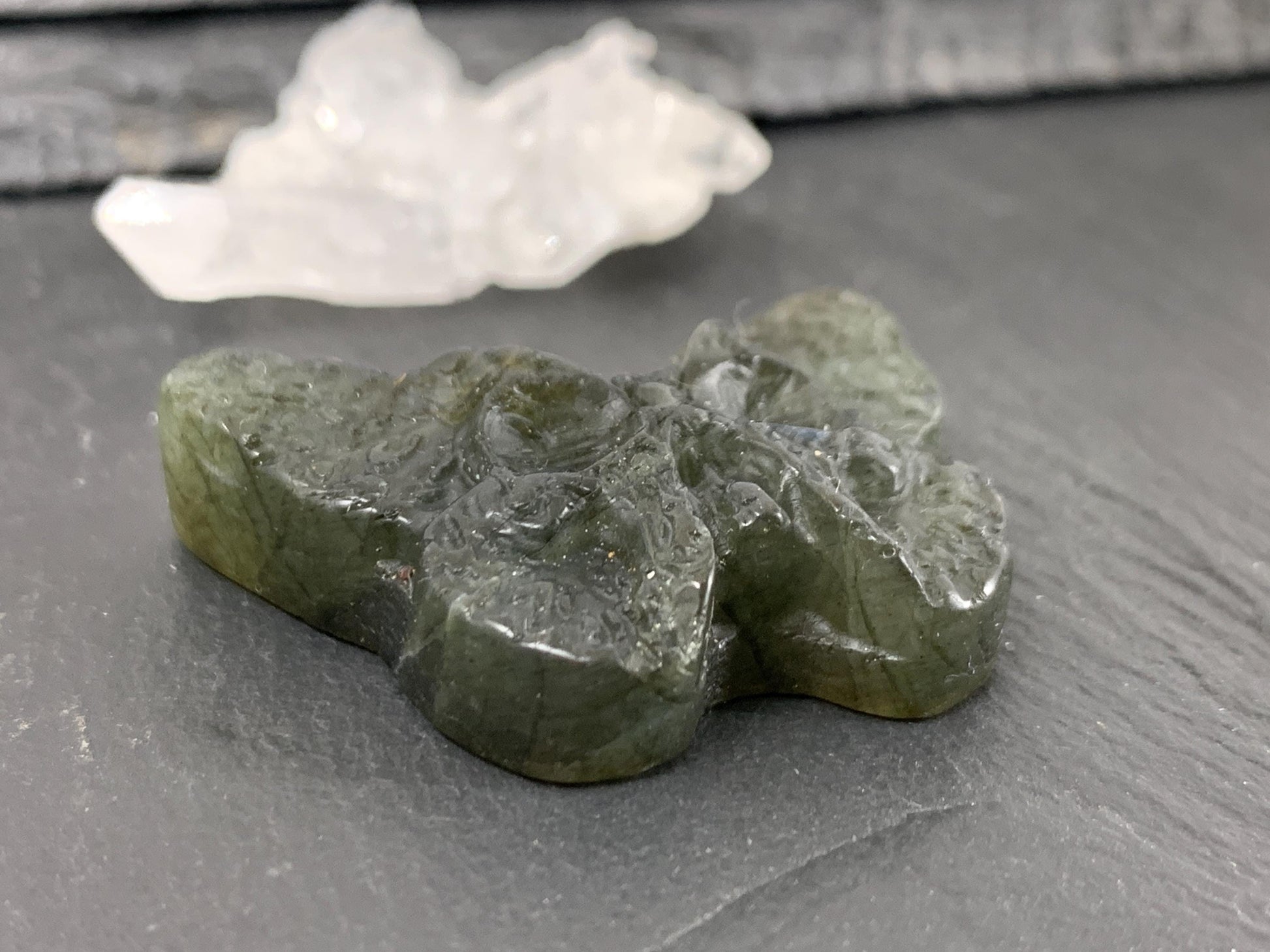 Enhance your collection or craft exceptional jewelry pieces with this labradorite ghost face carving that combines natural beauty, skilled artistry, and functional design in one captivating gemstone butterfly sculpture.