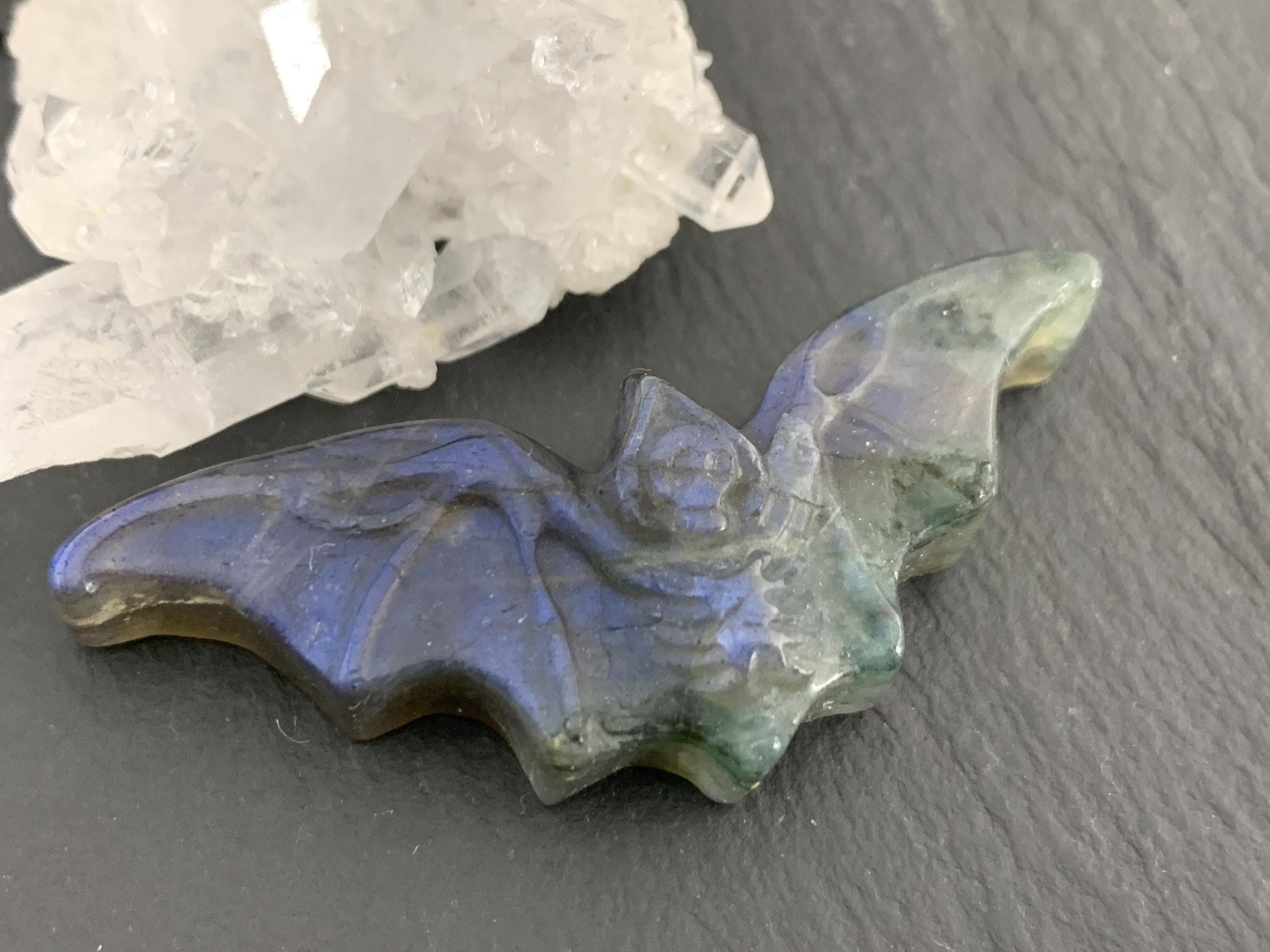 Labradorite skeleton bat 19x49mm flat back carving