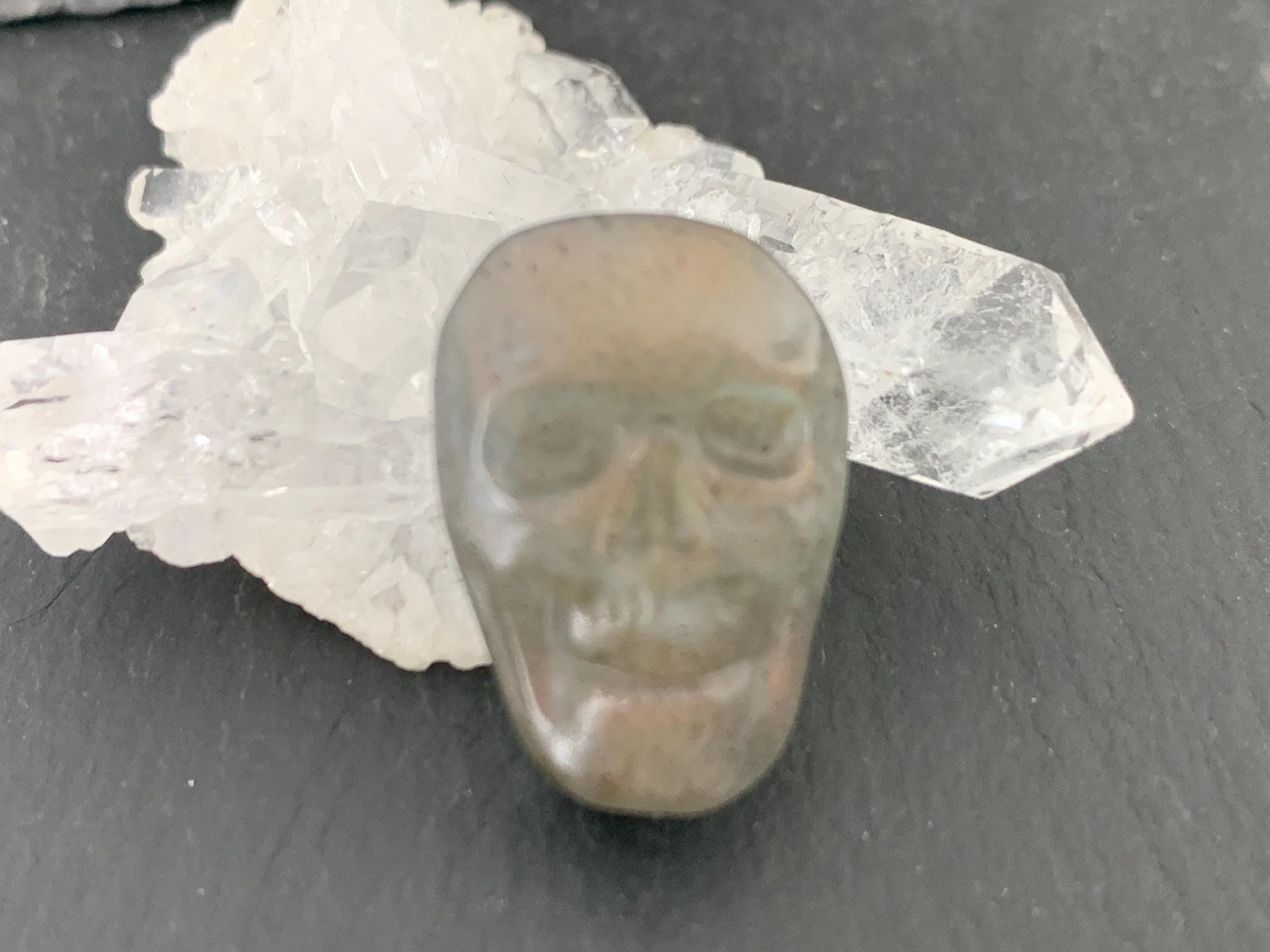 This labradorite skull cabochon is ideal for creating one-of-a-kind jewelry pieces or adding a mystical touch to your collection. Its green stone skull hues and unique gemstone pattern make it a captivating choice for artisans and collectors alike.
