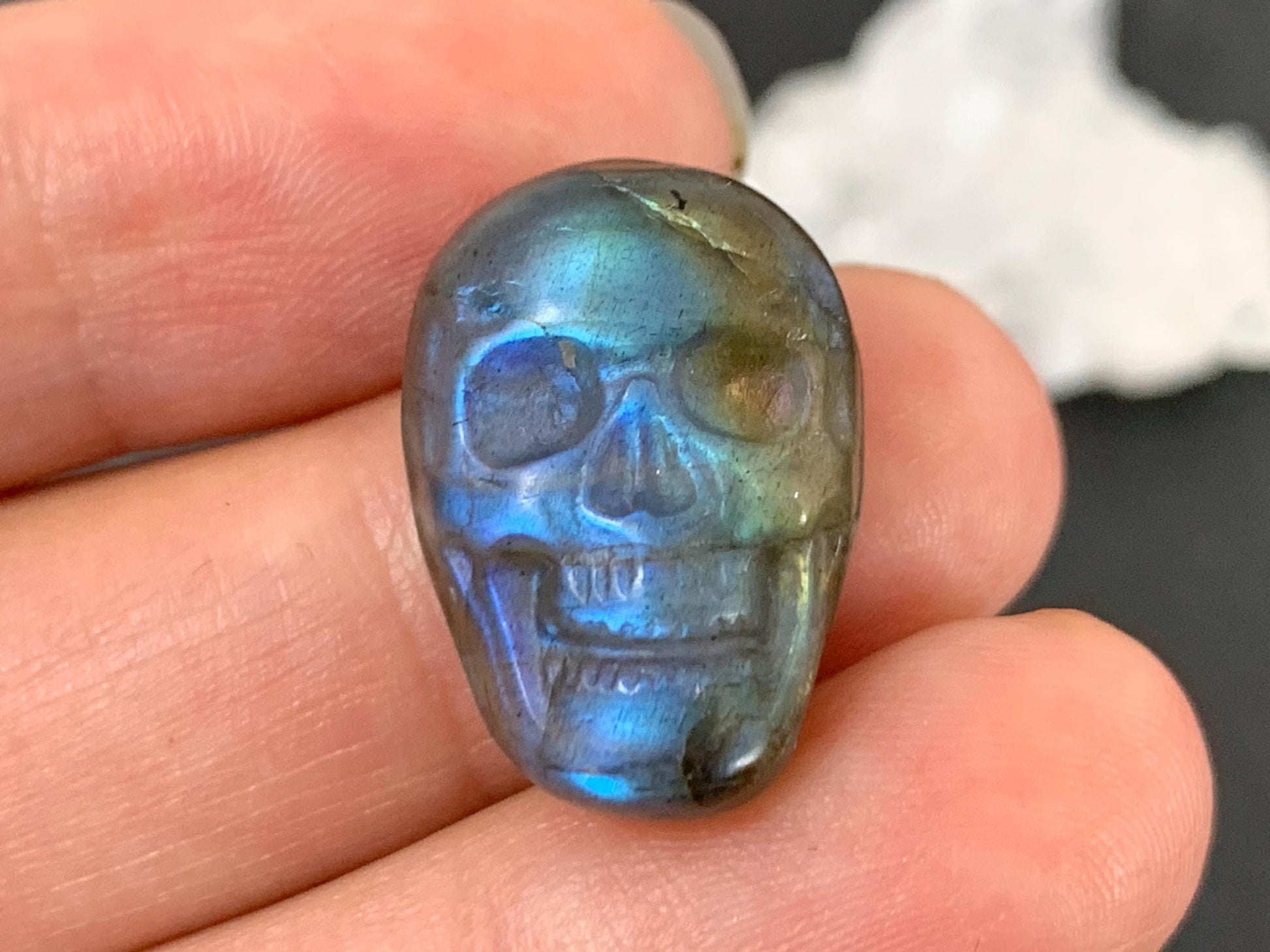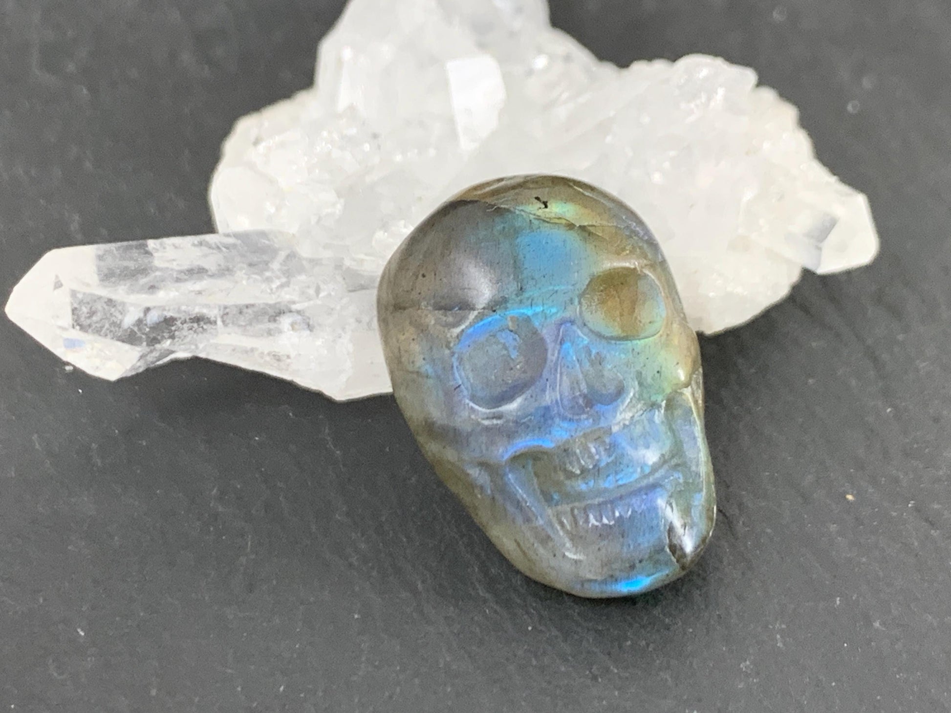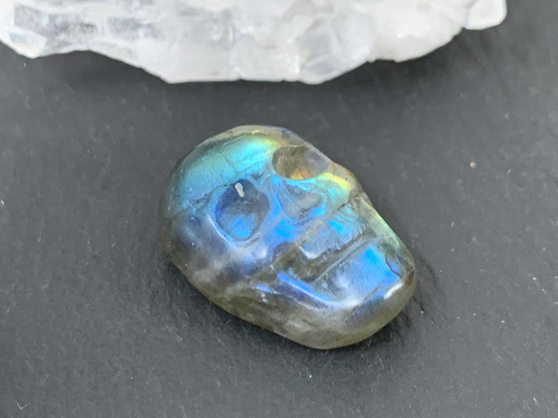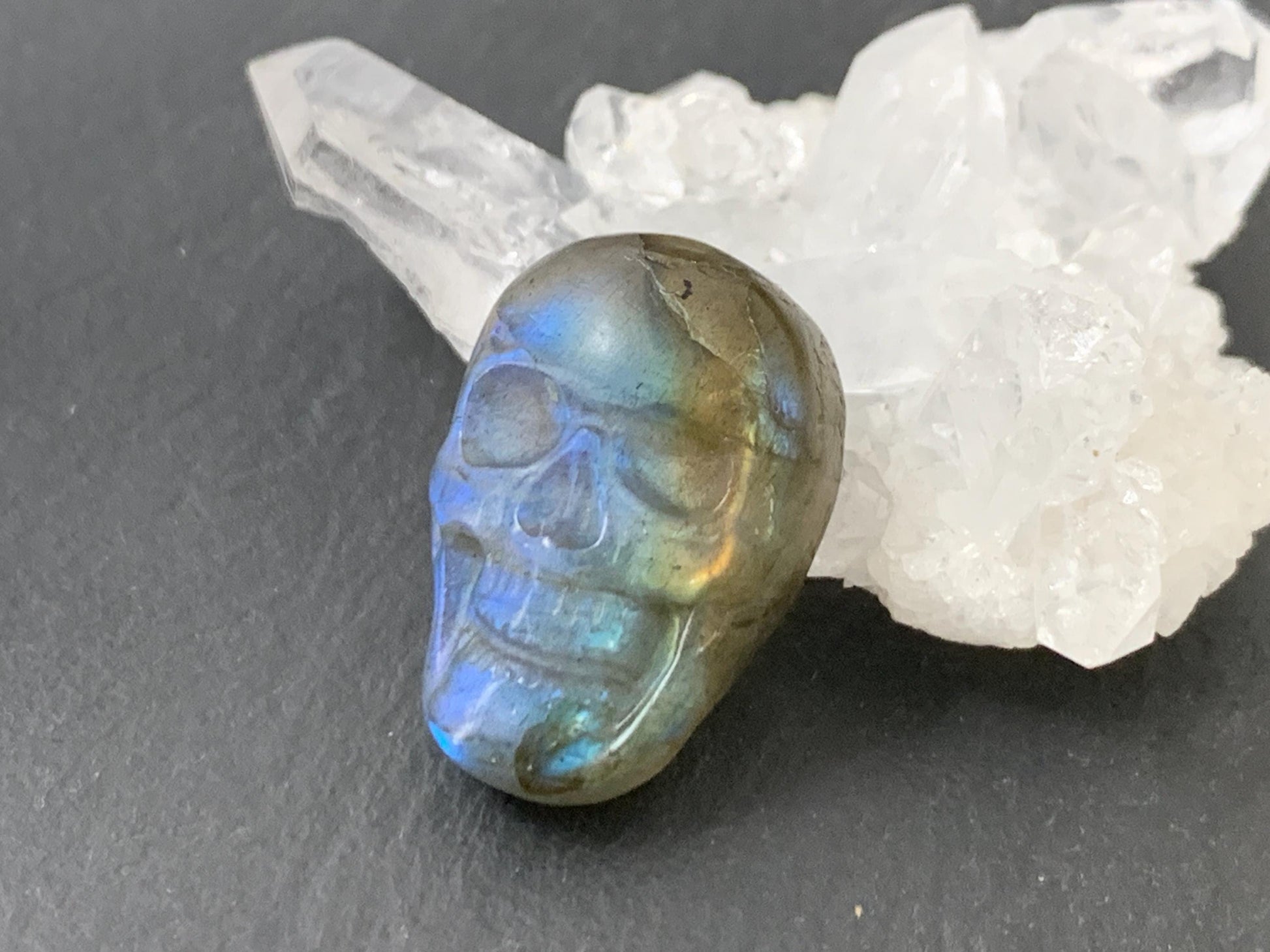 Add this natural labradorite gem to your collection today and enjoy the exceptional charm of a carved skull stone that blends mystic green hues with the timeless appeal of natural gemstones.