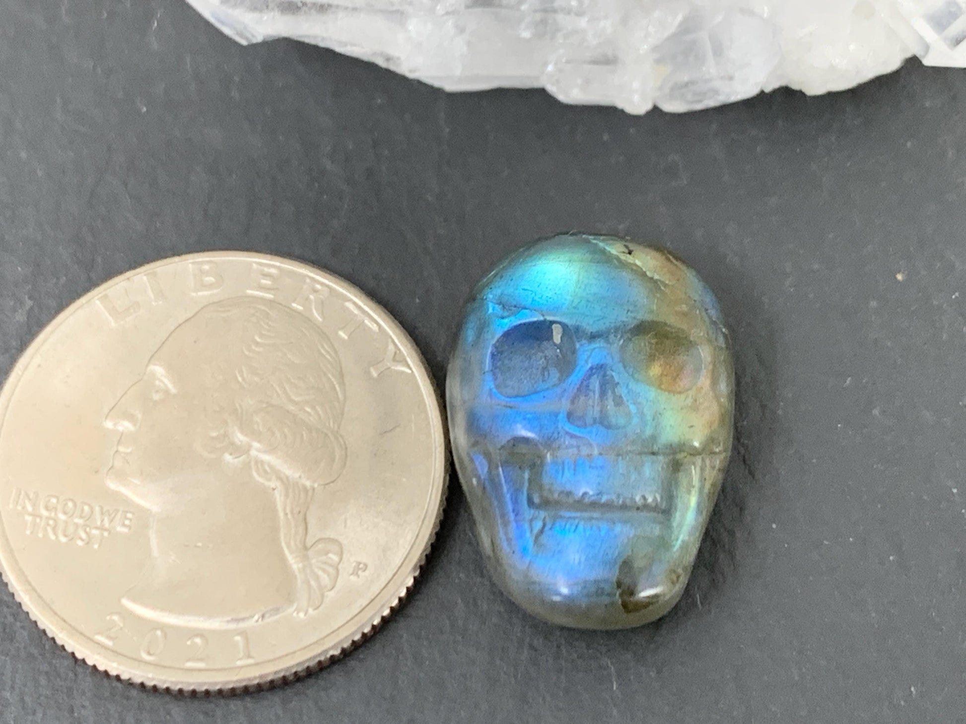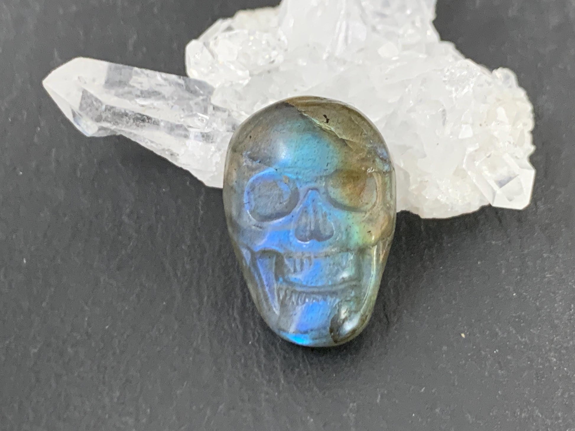 This labradorite skull is a unique 15x21mm carved natural gemstone cabochon featuring a flat back carving in a mystic green gem hue. Perfect for Halloween jewelry and collectors, this skull cabochon gem measures approximately 15x21mm with an 8mm thickness, offering a striking green stone gem ideal for distinctive jewelry pieces or artistic projects. Each carved skull stone is a single, natural labradorite gem with signature flashes of color that enhance its mystic green gem appeal. Tested for quality and authenticity, this natural gemstone delivers both beauty and durability for your creative needs.