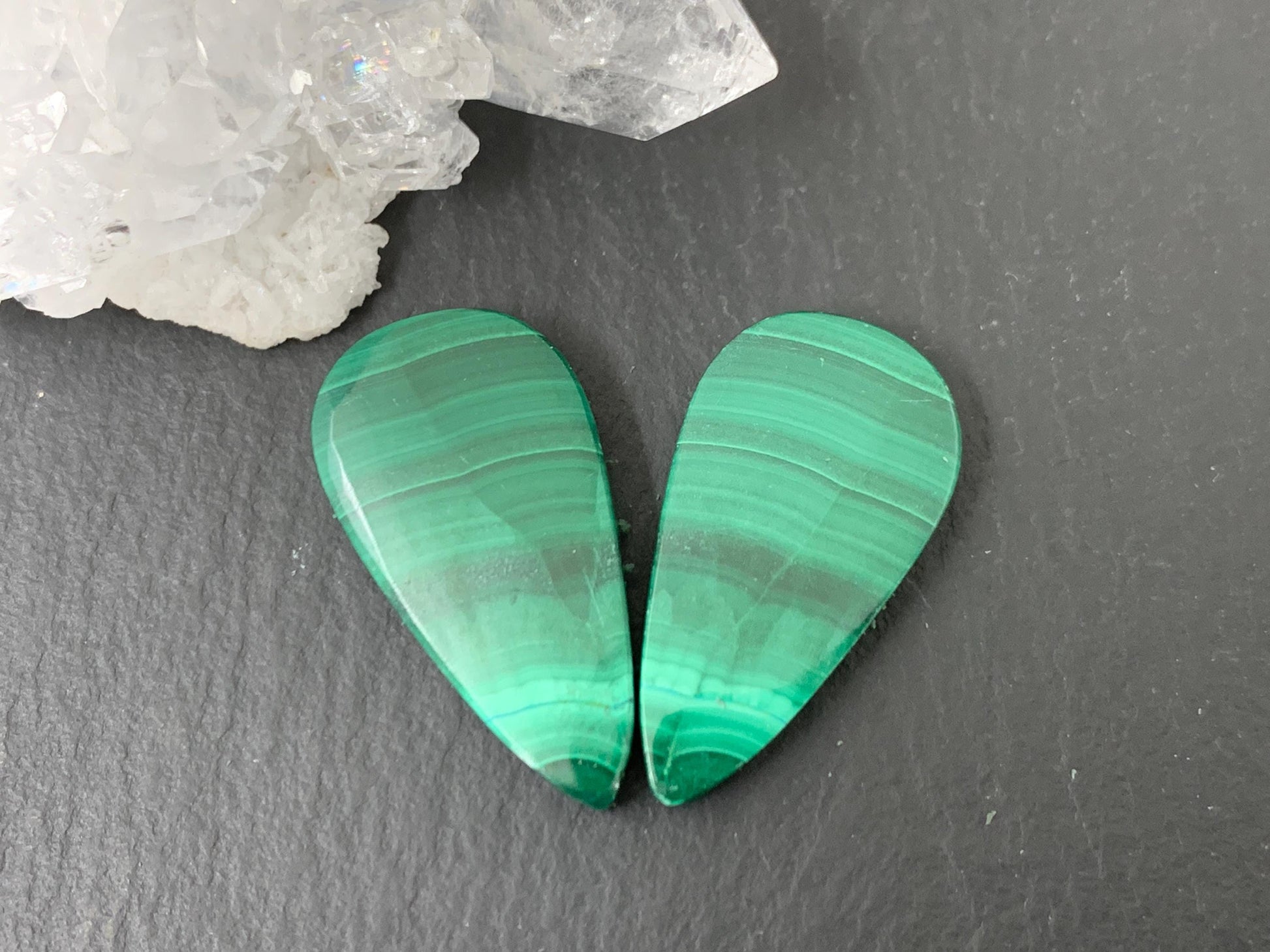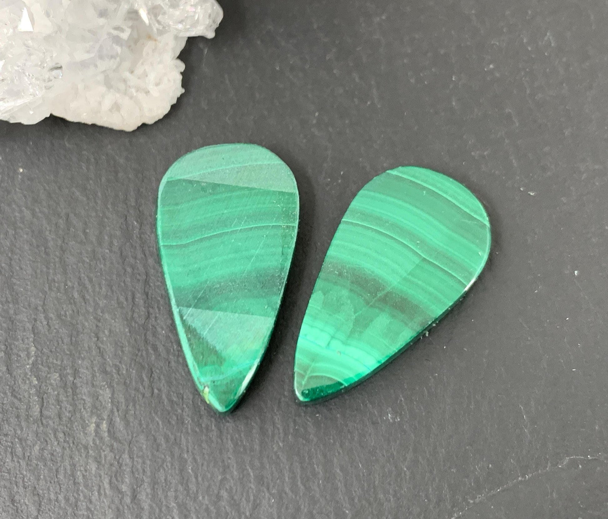 Malachite pear 13x25x4mm cabochon pair