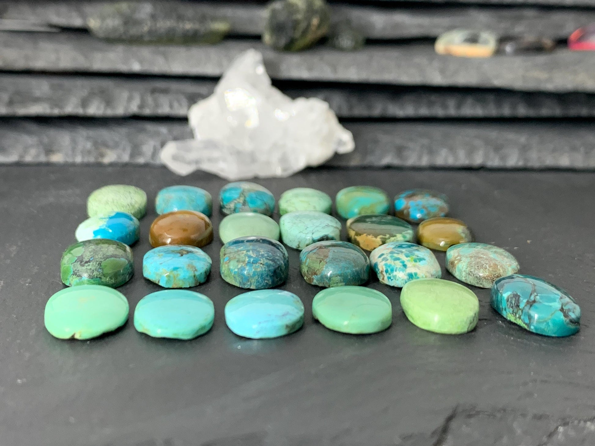 Gem Type: natural Tibetan Turquoise - cabochons are hand cut, can be uneven, back side is often not polished and have a line. Not recommended for jewelry with open back side