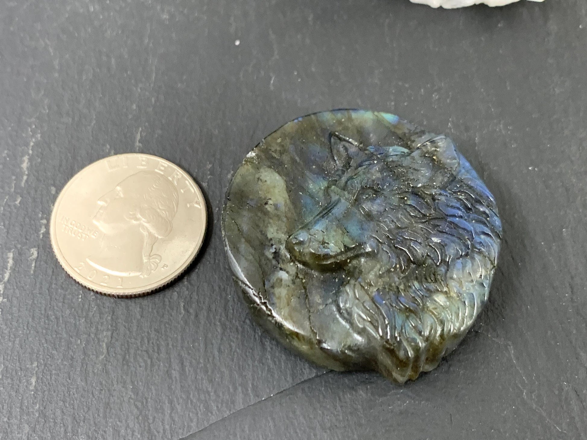 This wolf labradorite carving is a stunning 41mm natural labradorite gem expertly crafted into a carved wolf shape, designed as a flat back gemstone pendant for easy jewelry making. The wolf shaped gemstone pendant offers a unique blend of natural beauty and symbolic power, making it an ideal labradorite jewelry component for animal lovers and collectors alike. Measuring 41mm in diameter and 14mm thick, this sparkling labradorite stone features vibrant flashes of color that enhance its precious stone carving appeal.